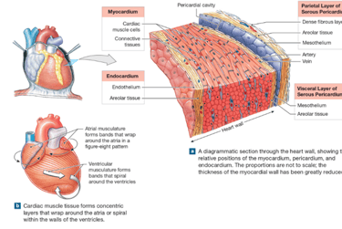 Middle Layer (in ventricles only): Muscle fibers arranged in a circular pattern (most prominent in the left ventricle since the left ventricle is the largest).