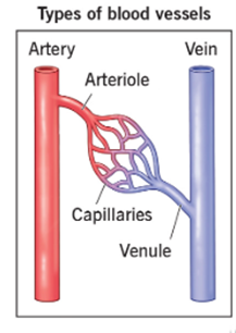 The above diagram from Cleveland Clinic shows how all the classifications of the blood vessels relate to one another. Imagine the capillaries (the small vessel branch toward the center) providing blood to tissues or muscles, deoxygenated blood and waste used up by the muscles enters the capillaries and will eventually end up in the venulesà veins to be transported to the lungs, kidneys, lymphatic system, or liver for waste removal. The role of arteriesà arterioles is then broken down to small capillaries to provide blood and nutrients to muscles.